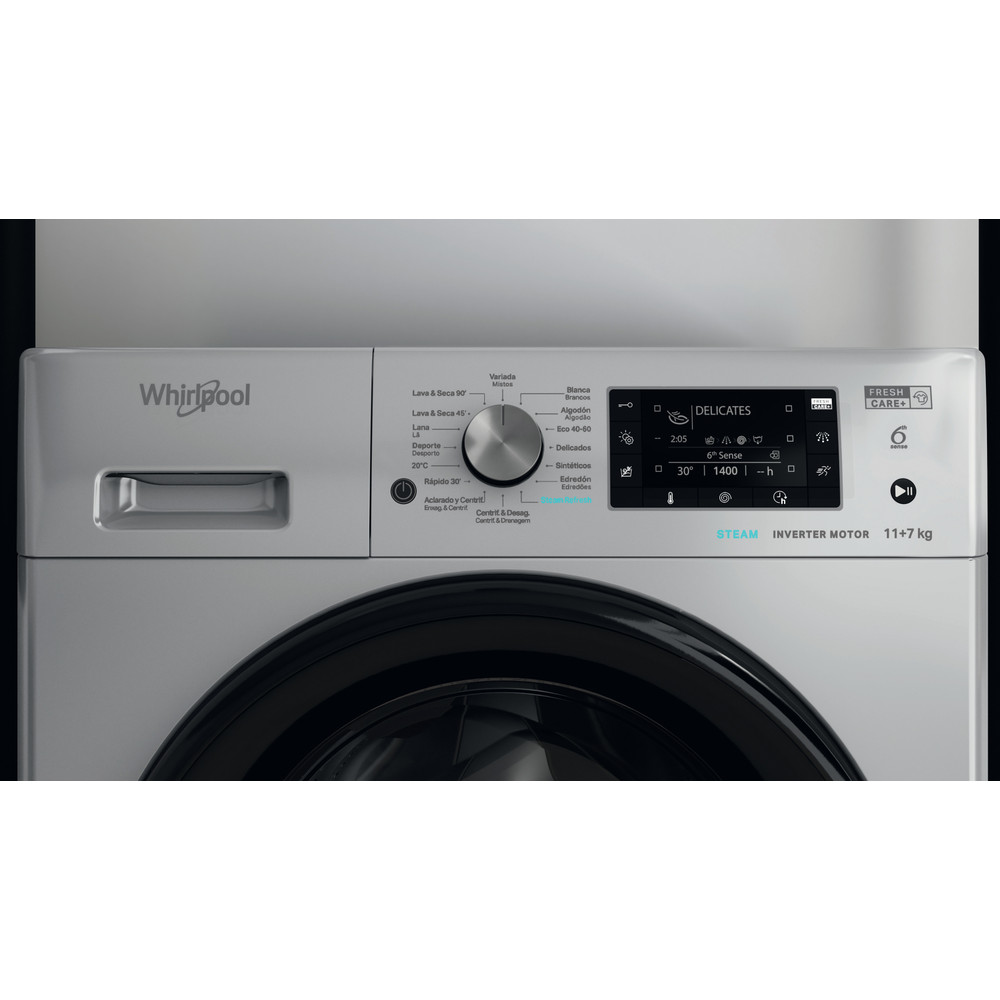 Esta máquina de lavar e secar roupa de livre instalação da Whirlpool inclui: cor prateada. Grande capacidade de lavagem, de 11,0kg. Capacidade de secagem de 7,0kg. Tecnologia exclusiva 6º SENTIDO, que monitoriza constantemente a humidade no interior do tambor, protegendo a sua roupa e proporcionando excelentes resultados de lavagem e secagem. Velocidade de centrifugação de 1400 rotações por minuto, para rapidez e uso eficaz dos recursos.